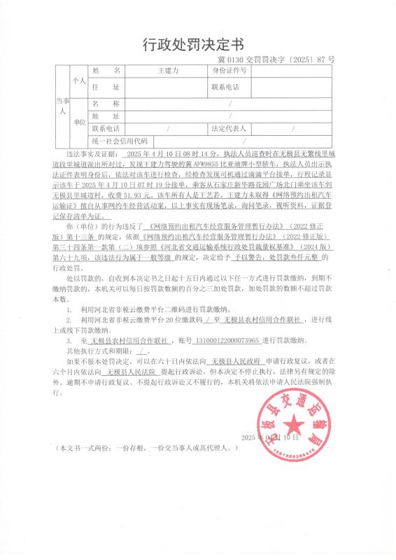 4月10日对王建力未取得《网络预约出租汽车运输证》擅自从事网约车经营活动案的行政处罚冀0130交罚罚决字【2025】87号
