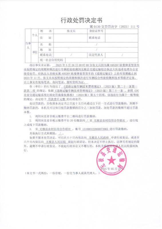 5月26日对张文兵未按照规定的周期和频次进行车辆综合性能检测和技术等级评定案的行政处罚冀0130交罚罚决字【2025】111号
