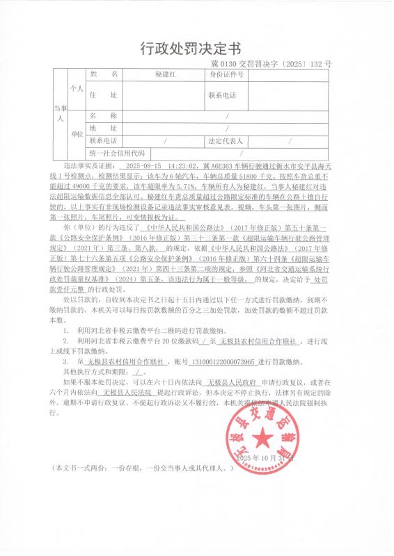 10月31日对秘建红车货总质量超过公路限定标准的车辆在公路上擅自行驶的行政处罚冀0130交罚罚决字【2025】132号