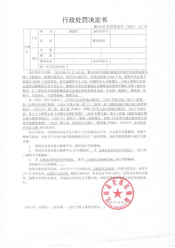 10月31日对秘建红车货总质量超过公路限定标准的车辆在公路上擅自行驶的行政处罚冀0130交罚罚决字【2025】131号