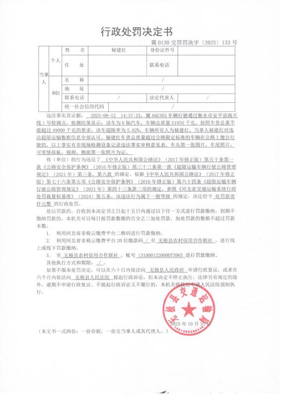 10月31日对秘建红车货总质量超过公路限定标准的车辆在公路上擅自行驶的行政处罚冀0130交罚罚决字【2025】133号