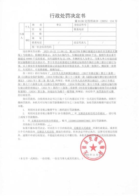 11月5日对李立车货总质量超过公路限定标准的车辆在公路上擅自行驶行为案的行政处罚冀0130交罚罚决字【2025】134号