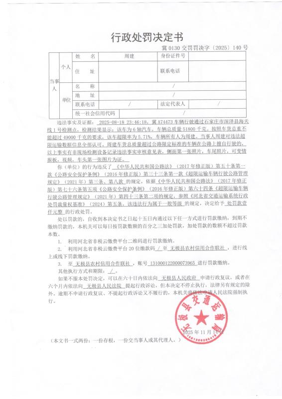 11月14日对周建车货总质量超过公路限定标准的车辆在公路上擅自行驶案的行政处罚冀0130交罚罚决字【2025】140号
