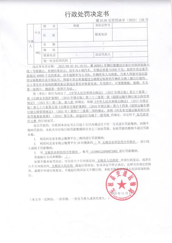 11月14日对周建车货总质量超过公路限定标准的车辆在公路上擅自行驶案的行政处罚冀0130交罚罚决字【2025】138号