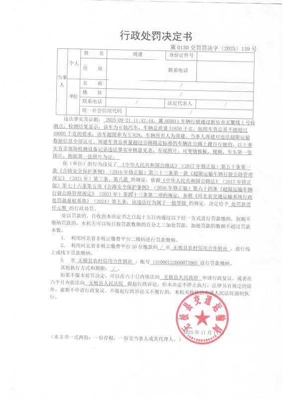 11月14日对周建车货总质量超过公路限定标准的车辆在公路上擅自行驶案的行政处罚冀0130交罚罚决字【2025】139号
