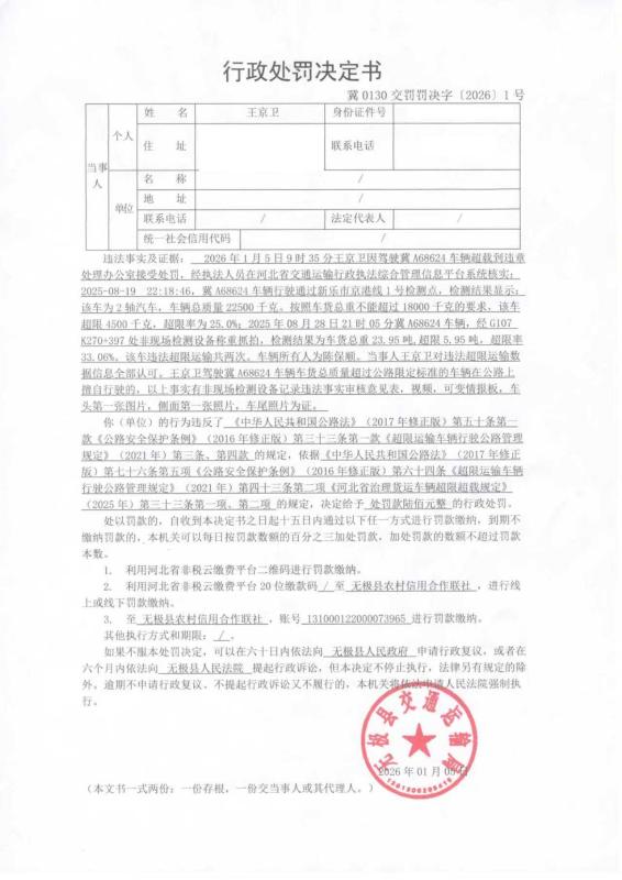 1月5日对王京卫车货总质量超过公路限定标准的车辆在公路上擅自行驶案的行政处罚冀0130交罚罚决字{2026}1号