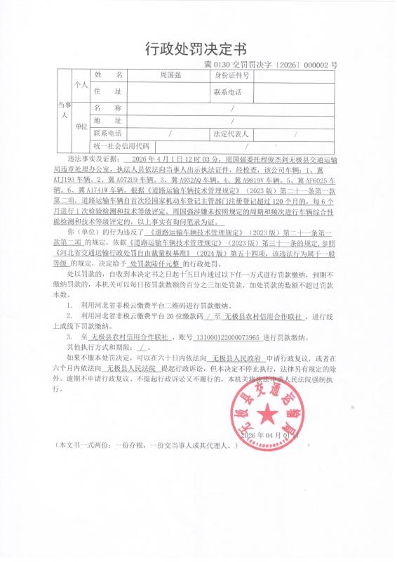 4月1日对周国强未按照规定的周期和频次进行车辆综合性能检测和技术等级评定案的行政处罚冀0130交罚罚决字【2026】000002号