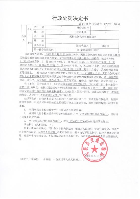 4月1日对无极县创枫商贸有限公司未按照规定的周期和频次进行车辆综合性能检测和技术等级评定案的行政处罚冀0130交罚罚决字【2026】10号