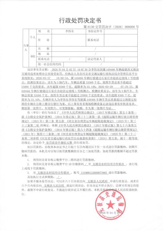 4月2日对李伟东车货总质量超过公路限定标准的车辆在公路上擅自行驶行为案的行政处罚冀0130交罚罚决字【2026】000008号