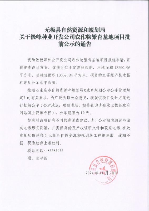 无极县自然资源和规划局关于极峰种业开发公司农作物繁育基地项目批前公示的通告