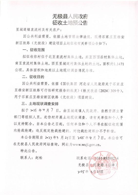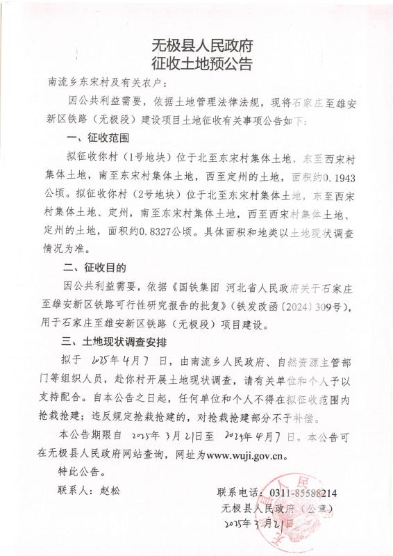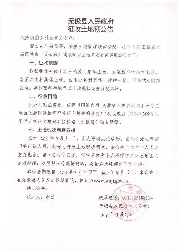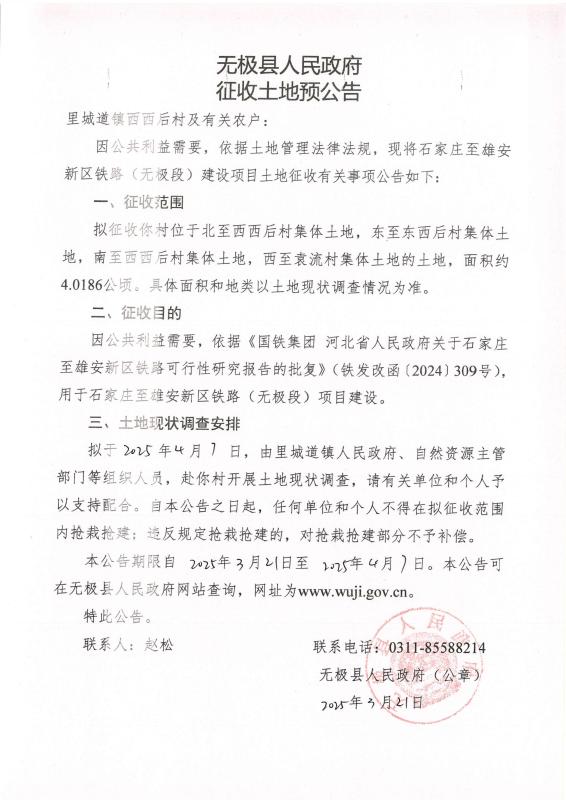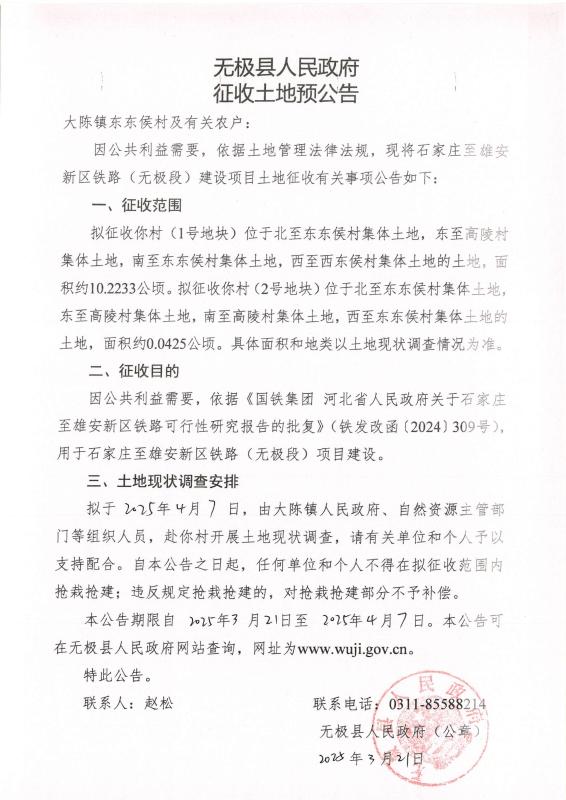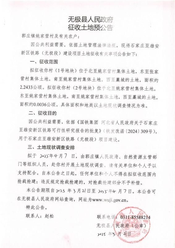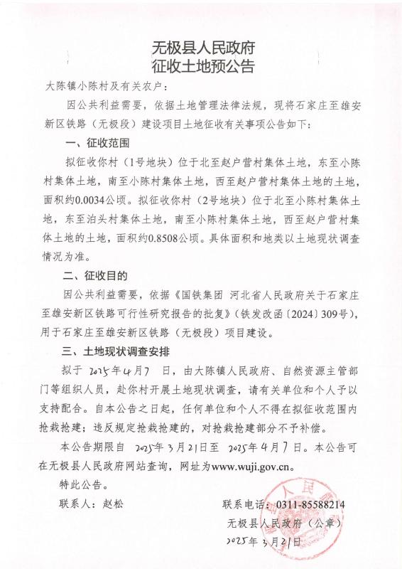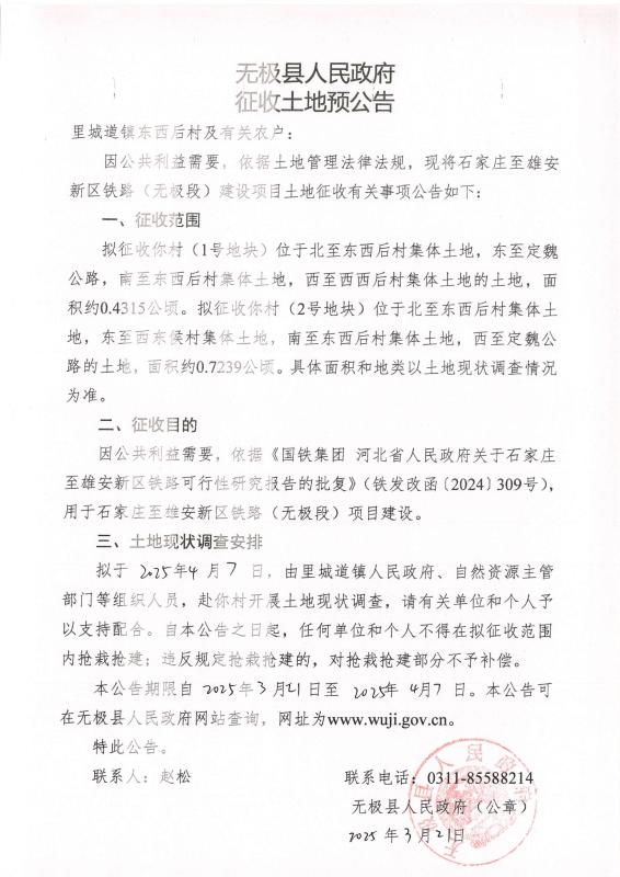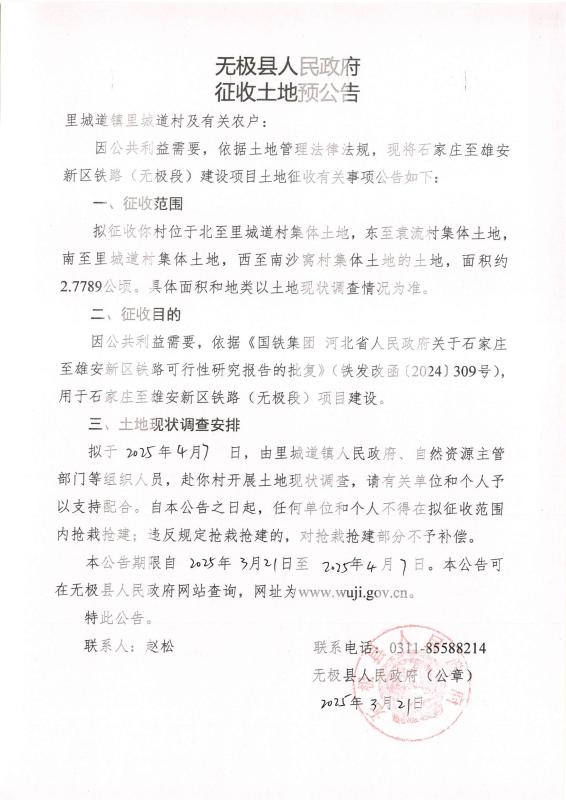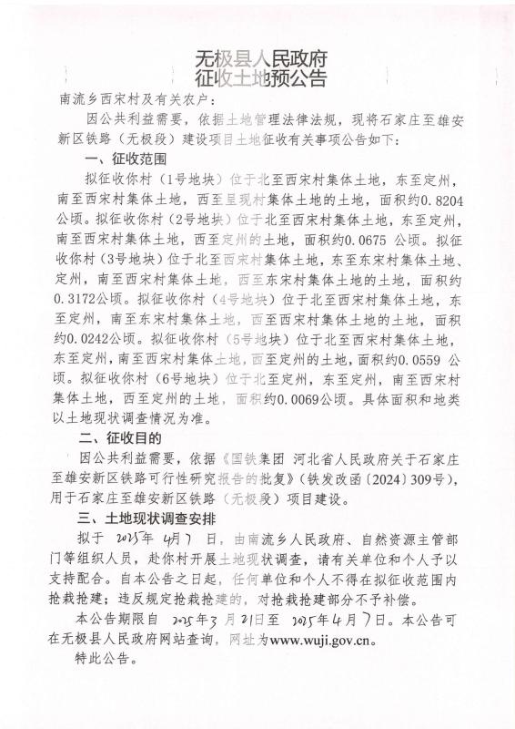 石家庄至雄安新区铁路(无极段)建设项目征收土地预公告