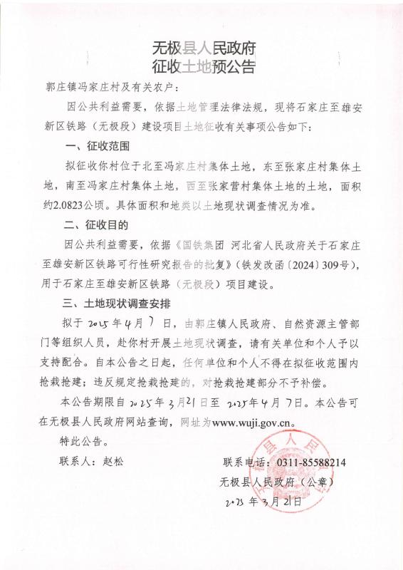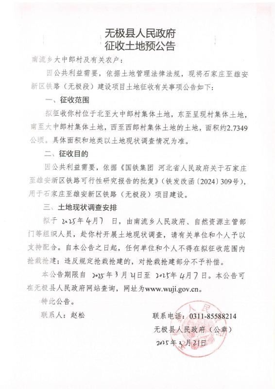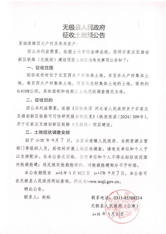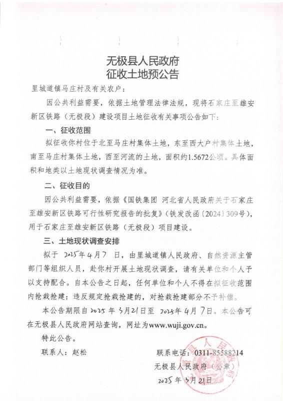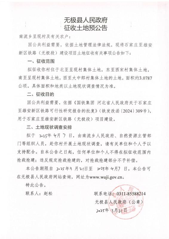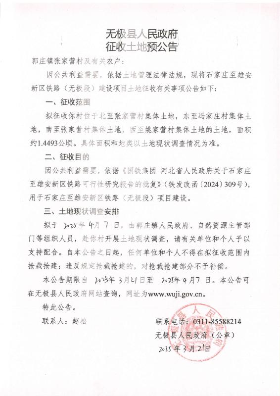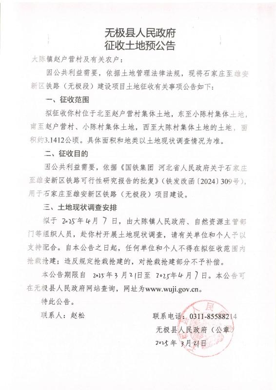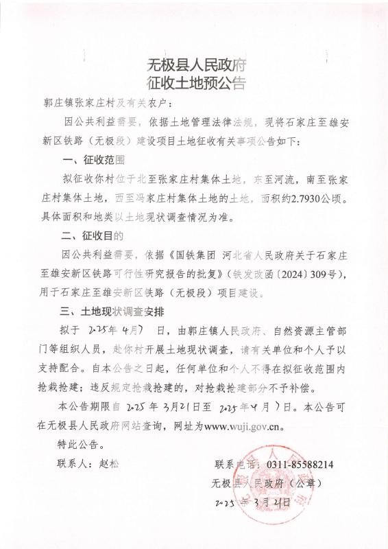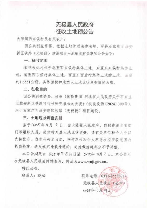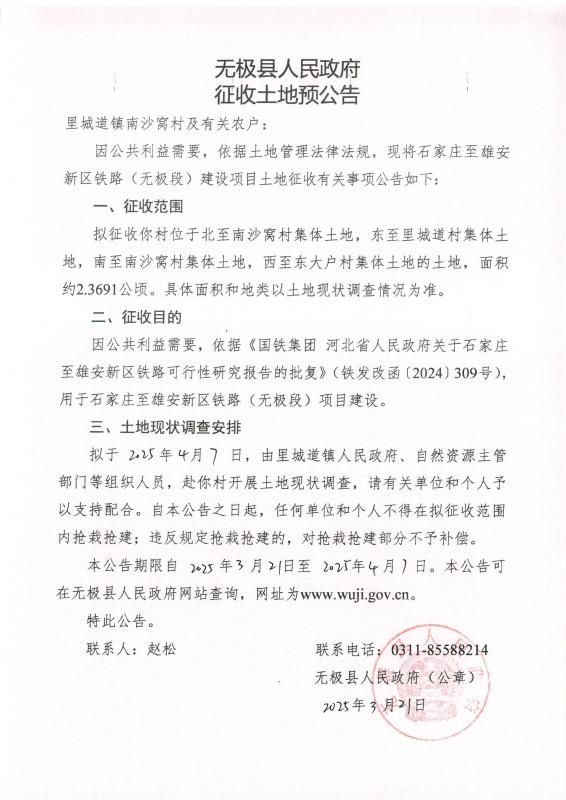 石家庄至雄安新区铁路(无极段)建设项目征收土地预公告