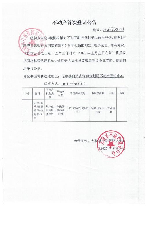 无极县千瑞智能科技有限公司不动产首次登记公告