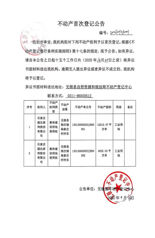 石家庄超达家饰股份有限公司不动产首次登记公告