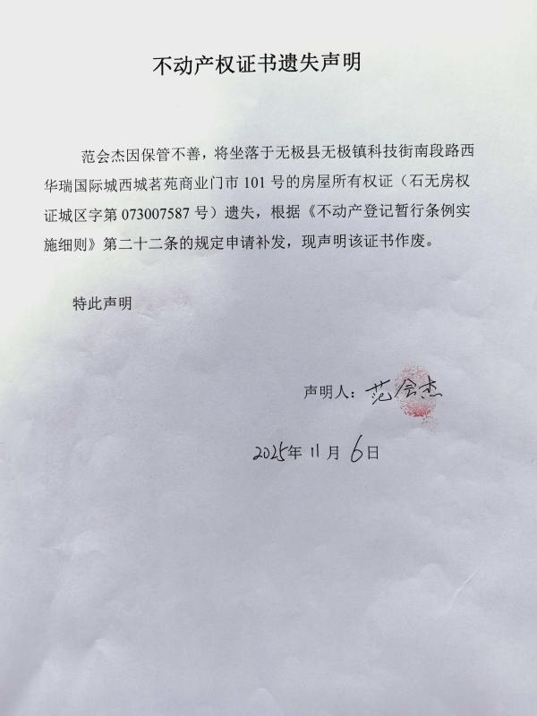 范会杰不动产权证书遗失声明