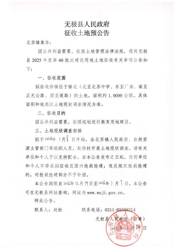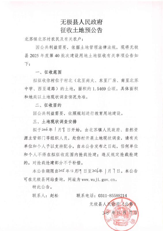 无极县2025年度第40批次建设用地土地征收预公告