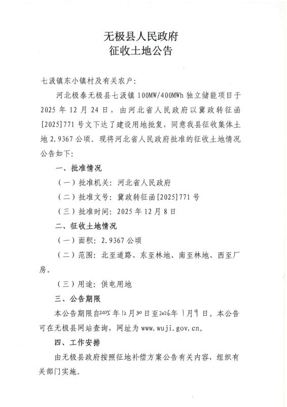 河北极泰无极县七汲镇100MW400MWh独立储能项目征收土地公告
