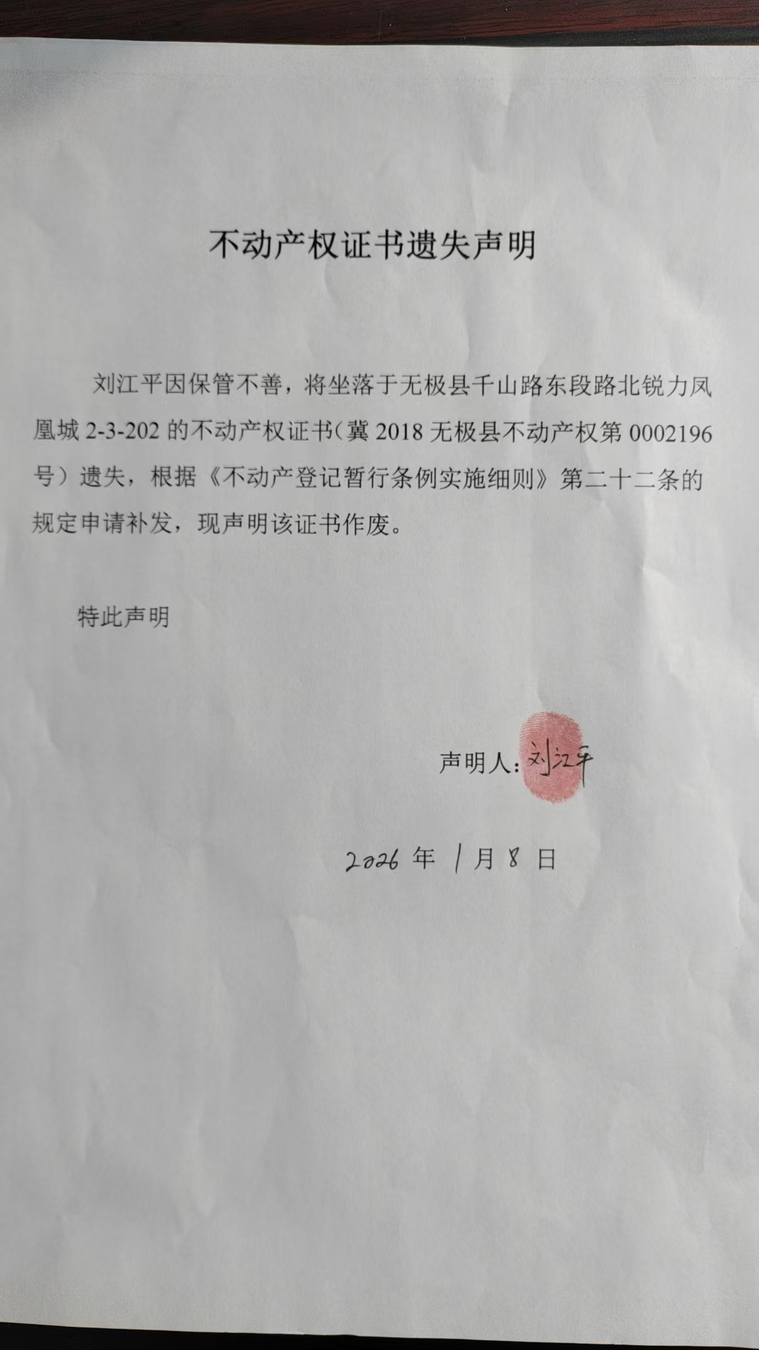 刘江平不动产权证书遗失声明