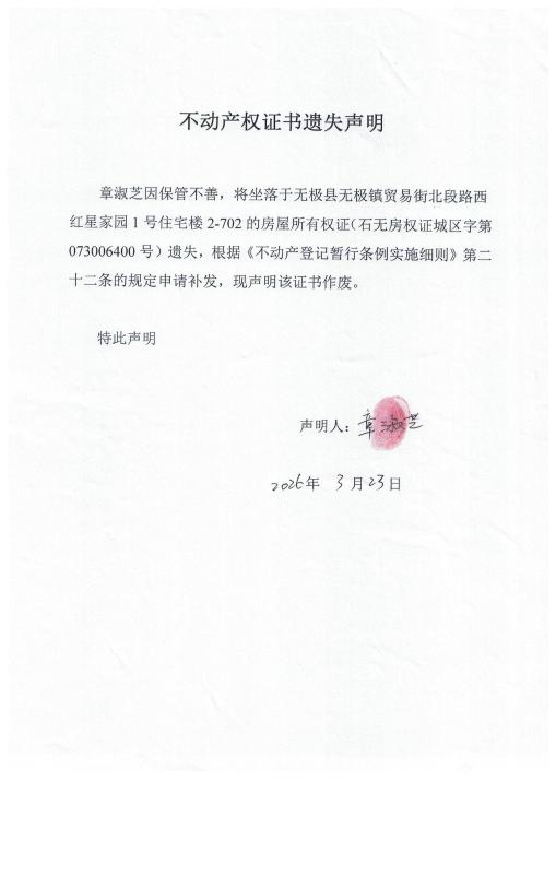 章淑芝不动产权证书遗失声明