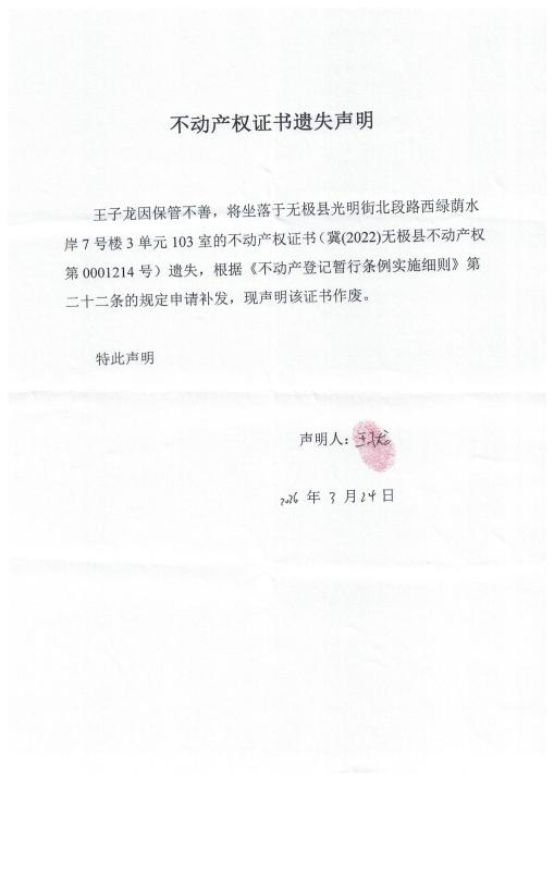王子龙不动产权证书遗失声明