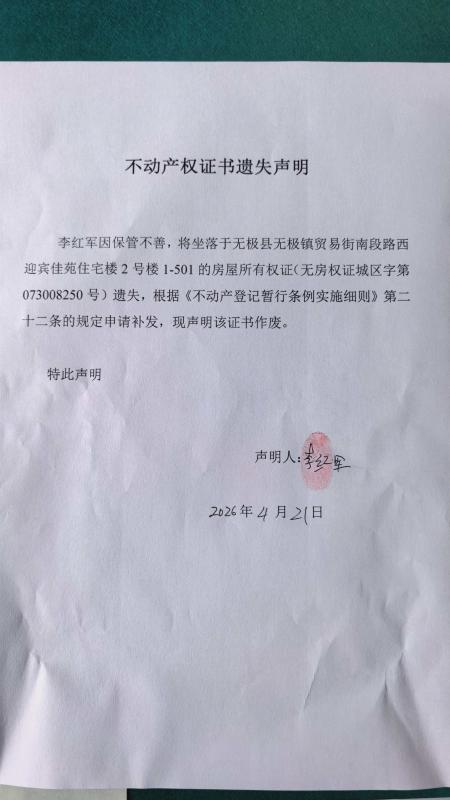 李红军不动产权证书遗失声明