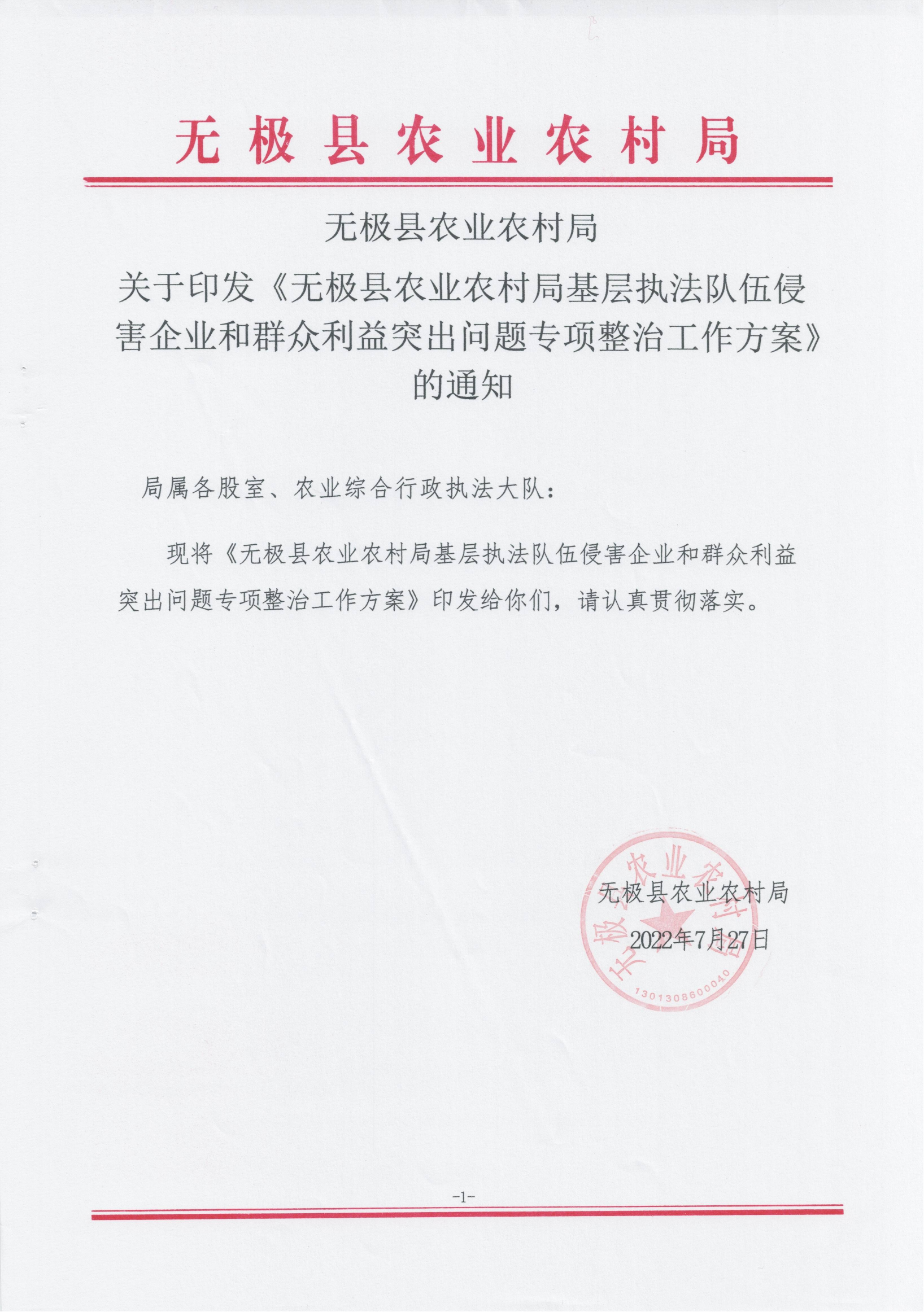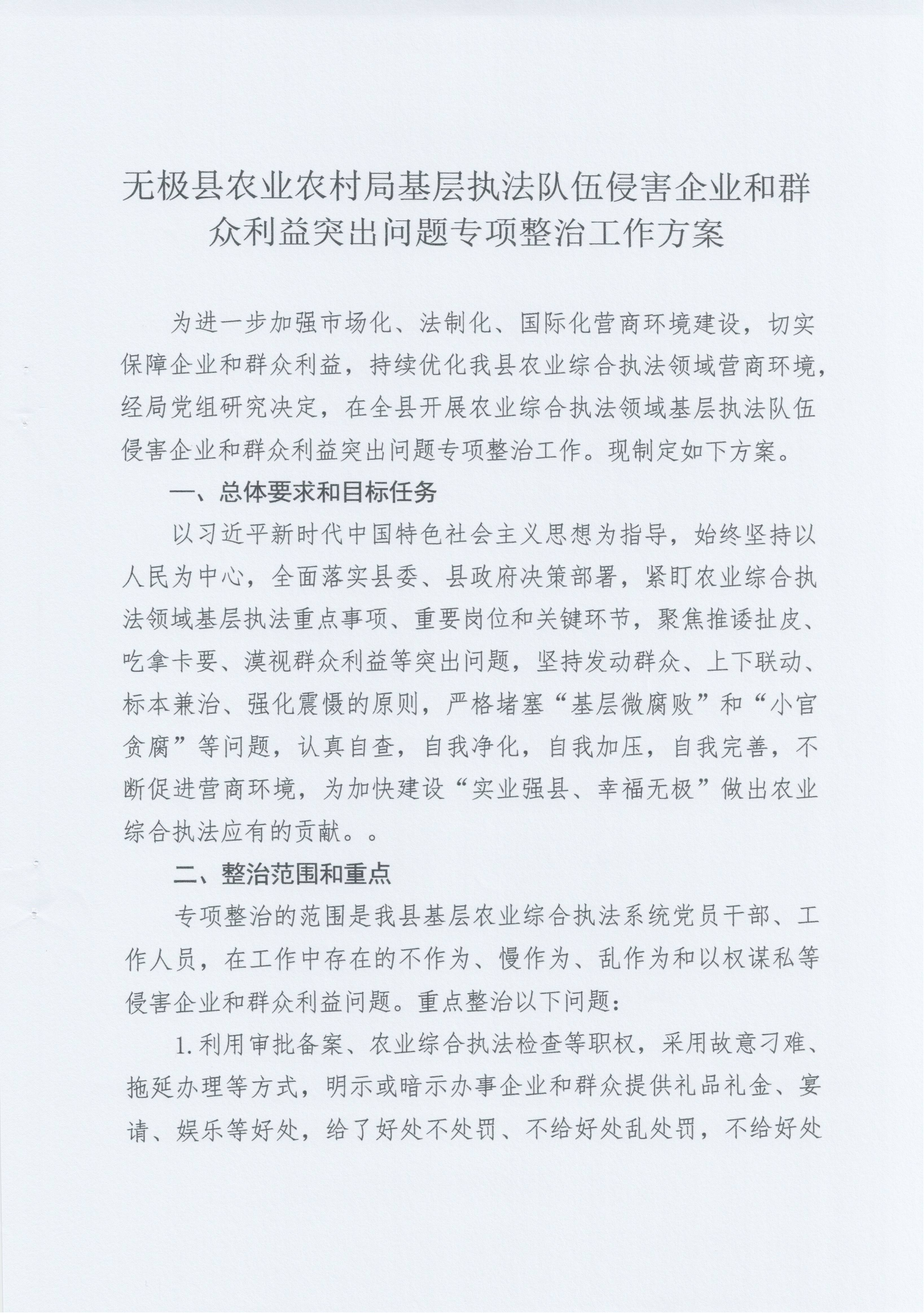 无极县农业农村局基层执法队伍侵害企业和群众利益突出问题专项整治工作方案