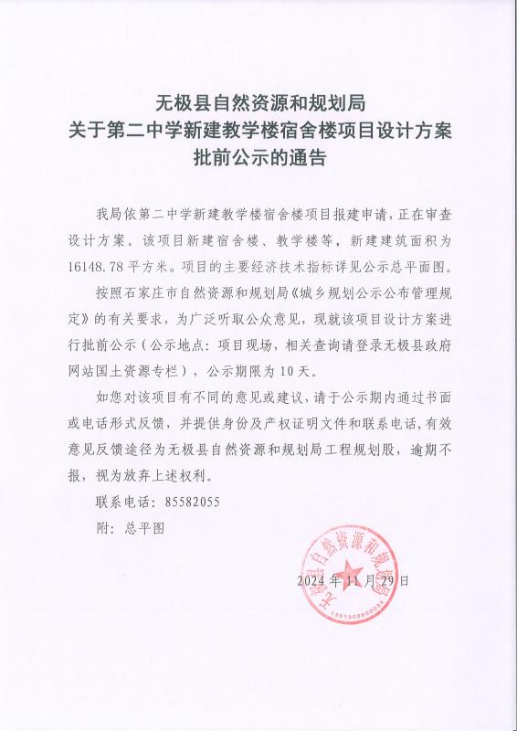 无极县自然资源和规划局关于第二中学新建教学楼宿舍楼项目设计方案批前公示的通告