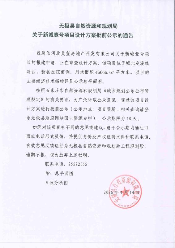无极县自然资源和规划局关于新城壹号项目设计方案批前公示的通告