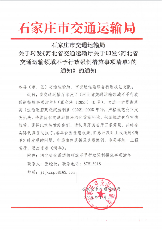 石家庄市交通运输局关于转发《河北省交通运输领域不予行政强制措施事项清单》的通知