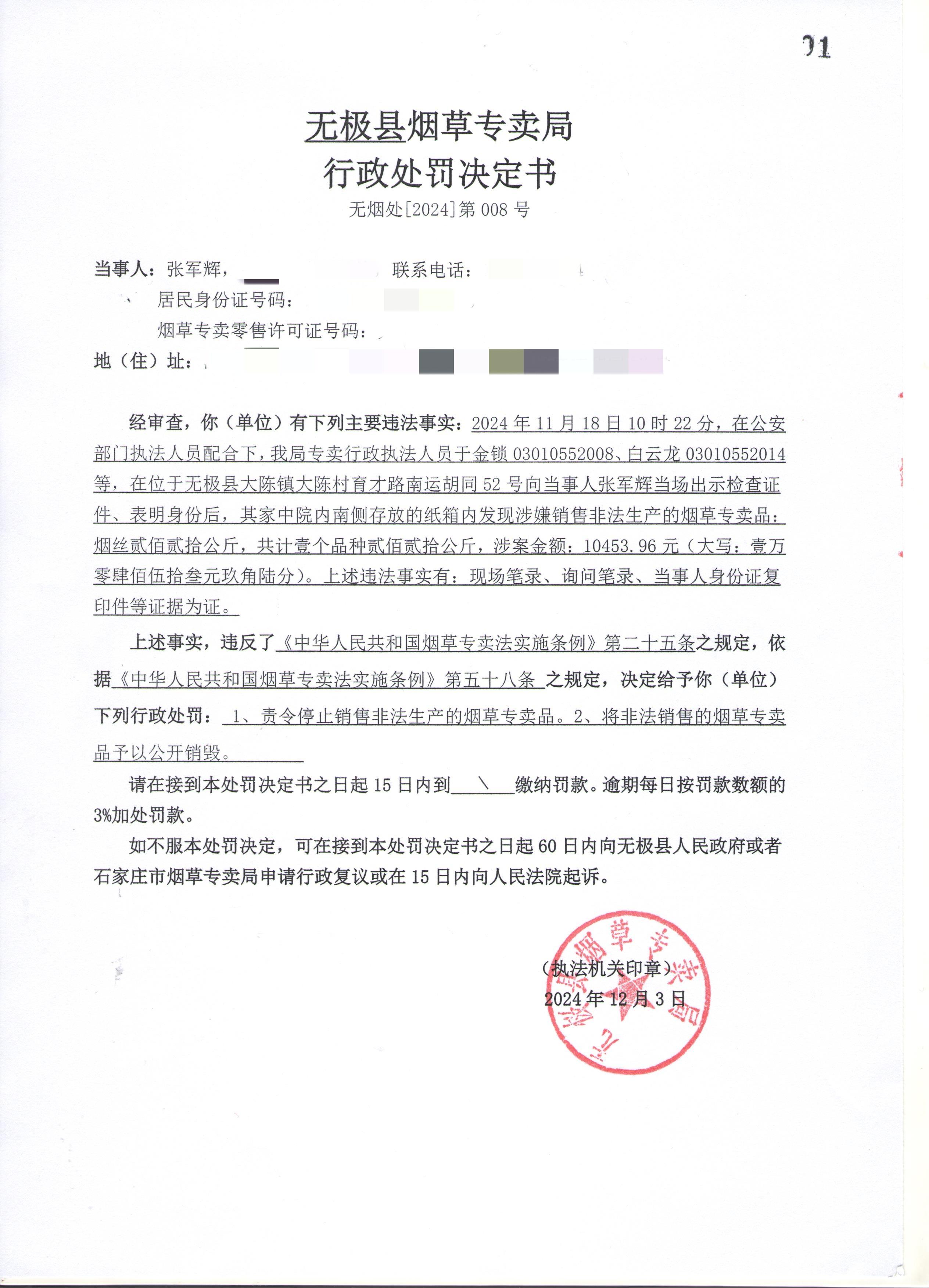 石家庄市无极县烟草专卖局行政处罚决定书(无烟处[2024]第008号)