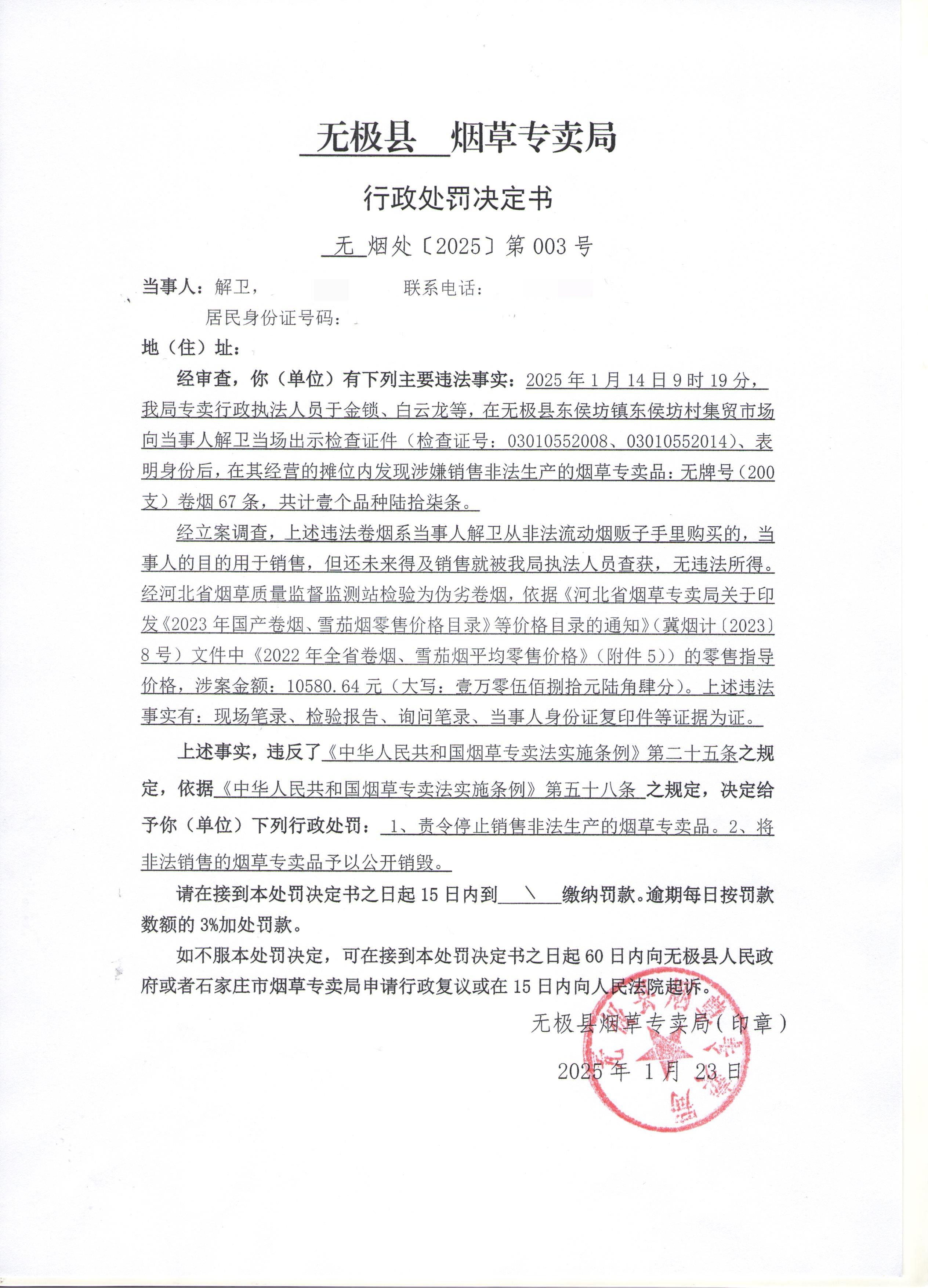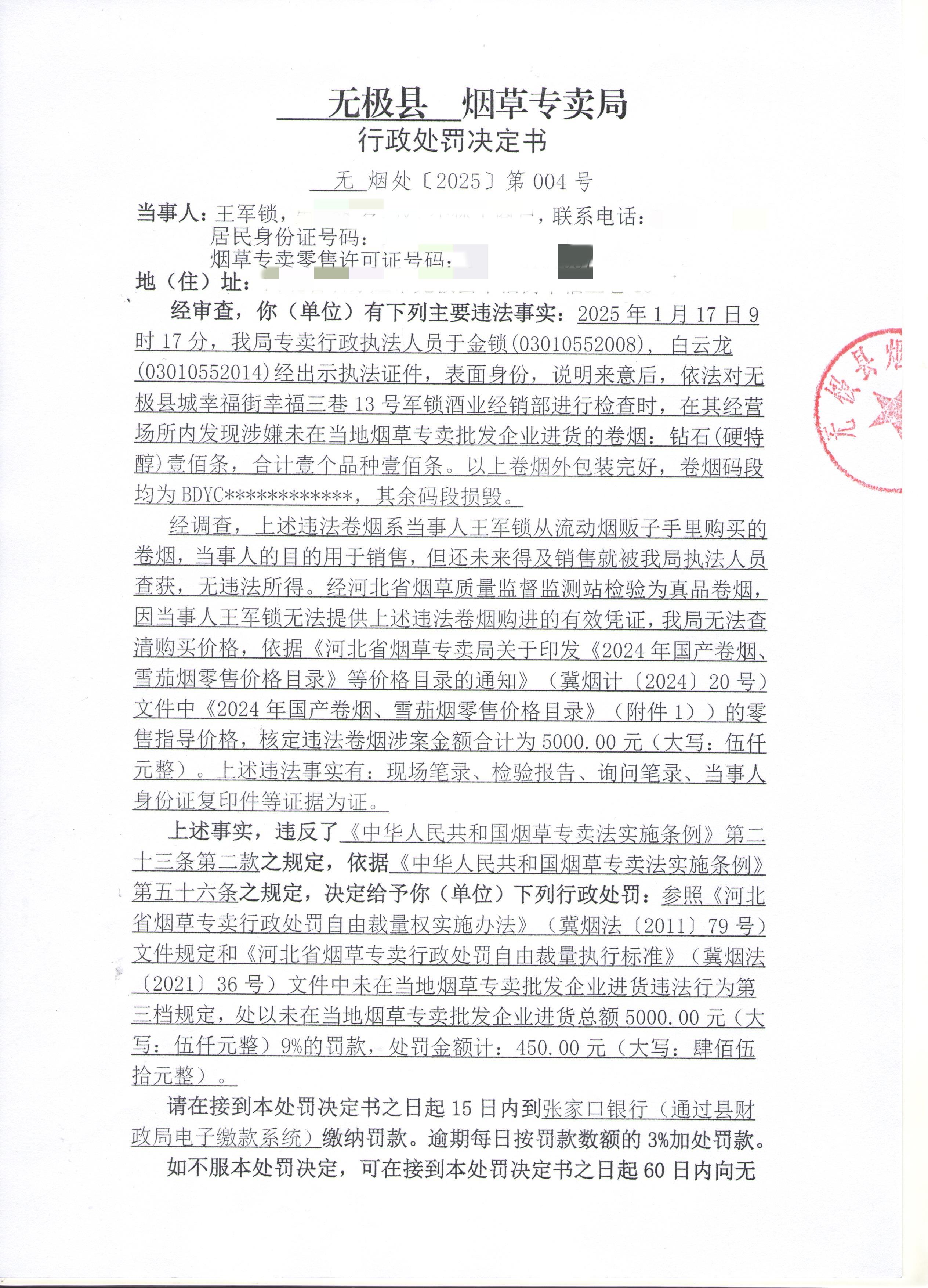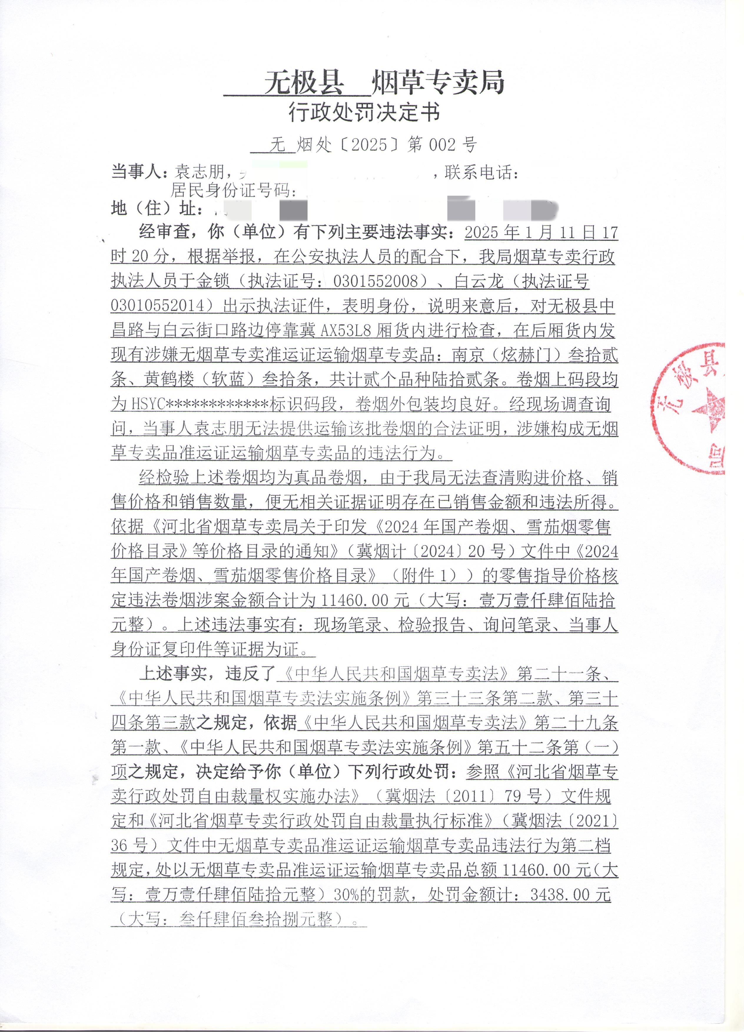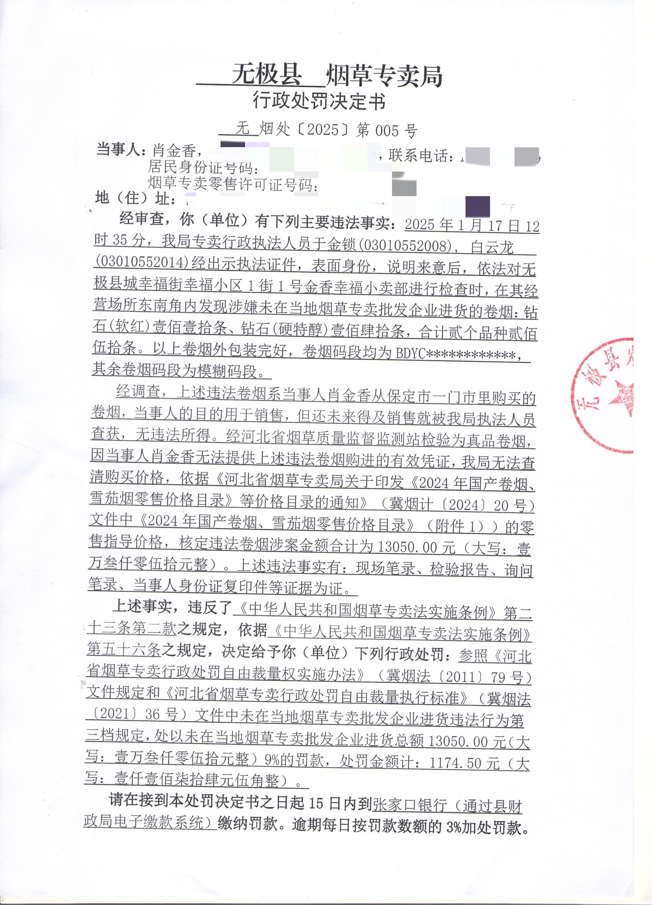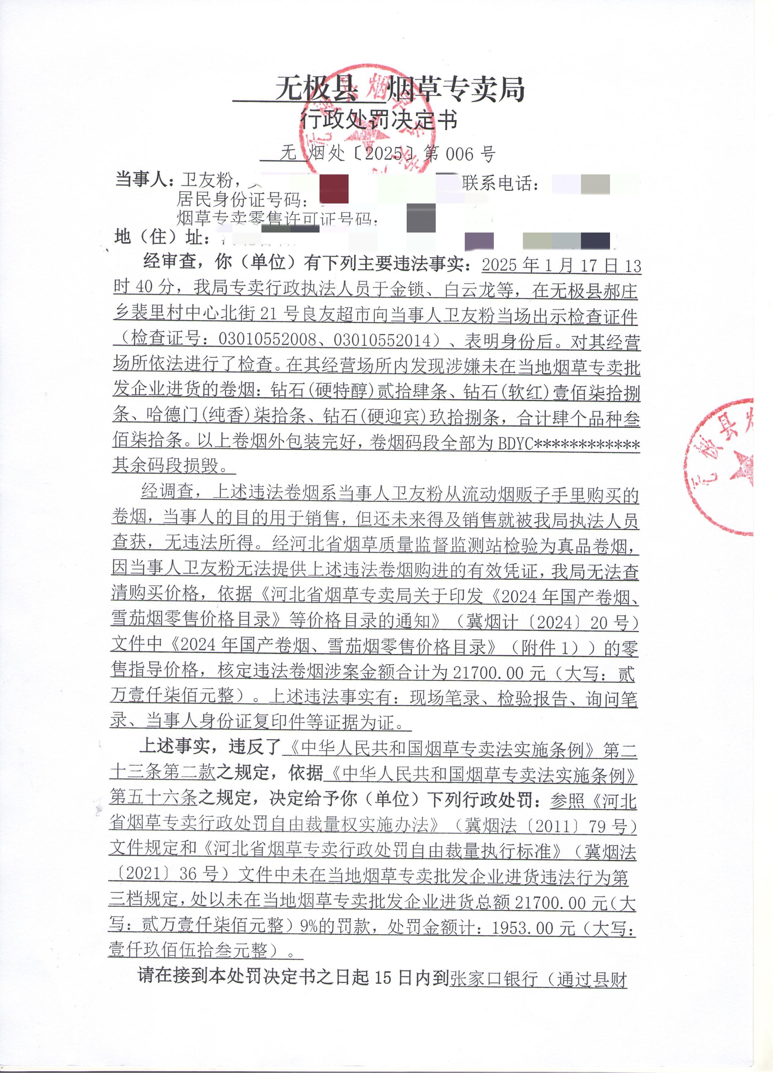 石家庄市无极县烟草专卖局行政处罚决定书(无烟处[2025]第002、003、004、005、006号)
