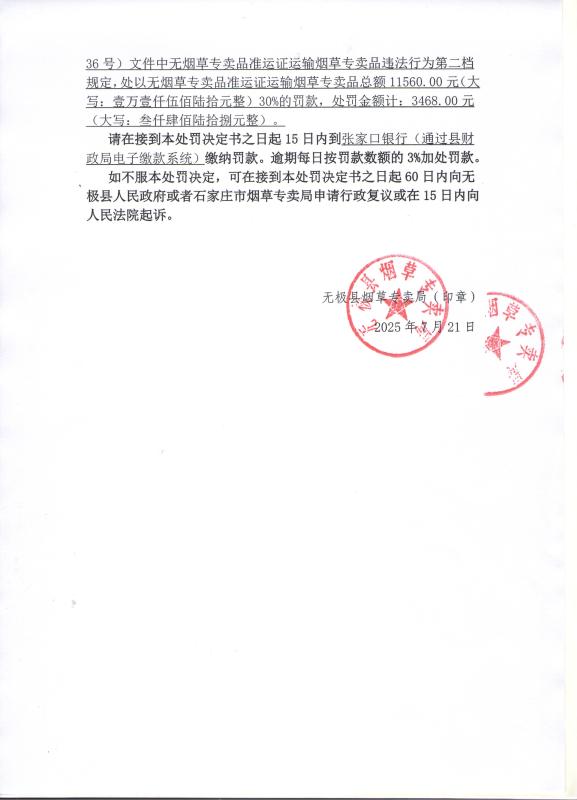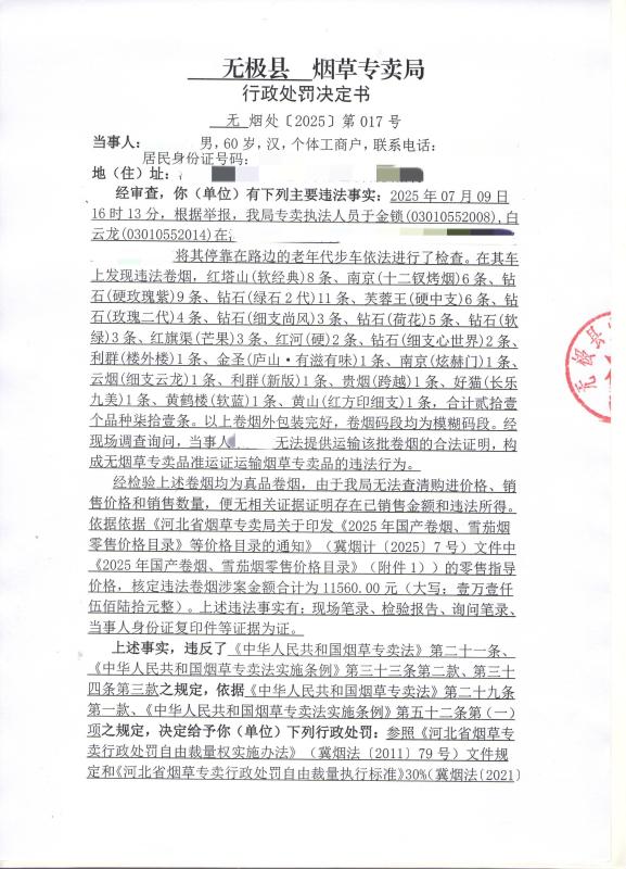 石家庄市无极县烟草专卖局行政处罚决定书(无烟处[2025]第017号)