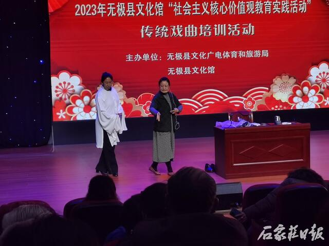 本次培训邀请了石家庄京剧团名家,国家京剧院刘秀荣老师大弟子关瑞英老师来授课,培训现场,关瑞英针对戏曲唱腔和表演、身段、戏曲理论等方面指导和纠正,现场讲解、实操示范,众多群众戏曲爱好者参与其中。老师教得仔细,一招一式、每个眼神,每个动作,都点点面面讲得精细;学员们学得认真,不仅学到了唱腔、功底、表演,也学到了国粹的文化精神。