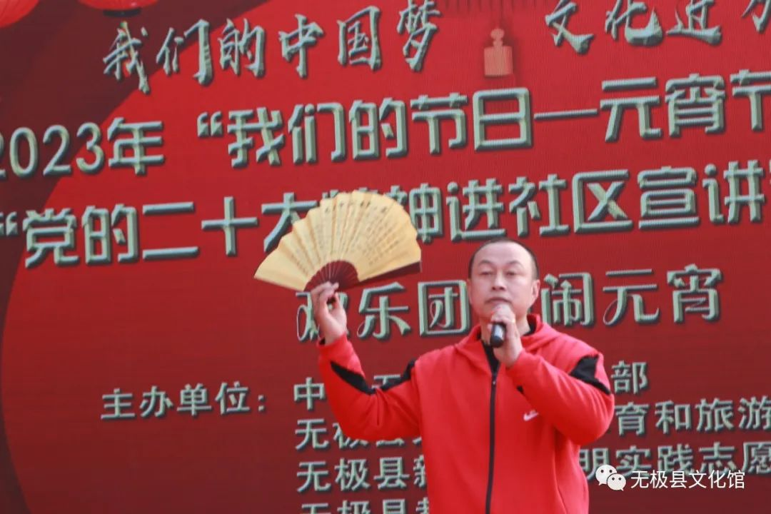 今天是农历正月十五,是中国传统的元宵佳节,中共无极县委宣传部、无极县文化广电体育和旅游局、无极县新时代文明实践志愿服务总队主办、无极县文化馆、无极县新时代文明实践文体分中心联合承办的我们的中国梦、文化进万家,无极县2023年“我们的节日—元宵节”暨“党的二十大精神进社区宣讲”文艺演出活动,在综合文化中心广场举办,丰富多彩的文艺节目吸引了广大群众的积极参与,让群众感受到传统节日带来的欢乐。