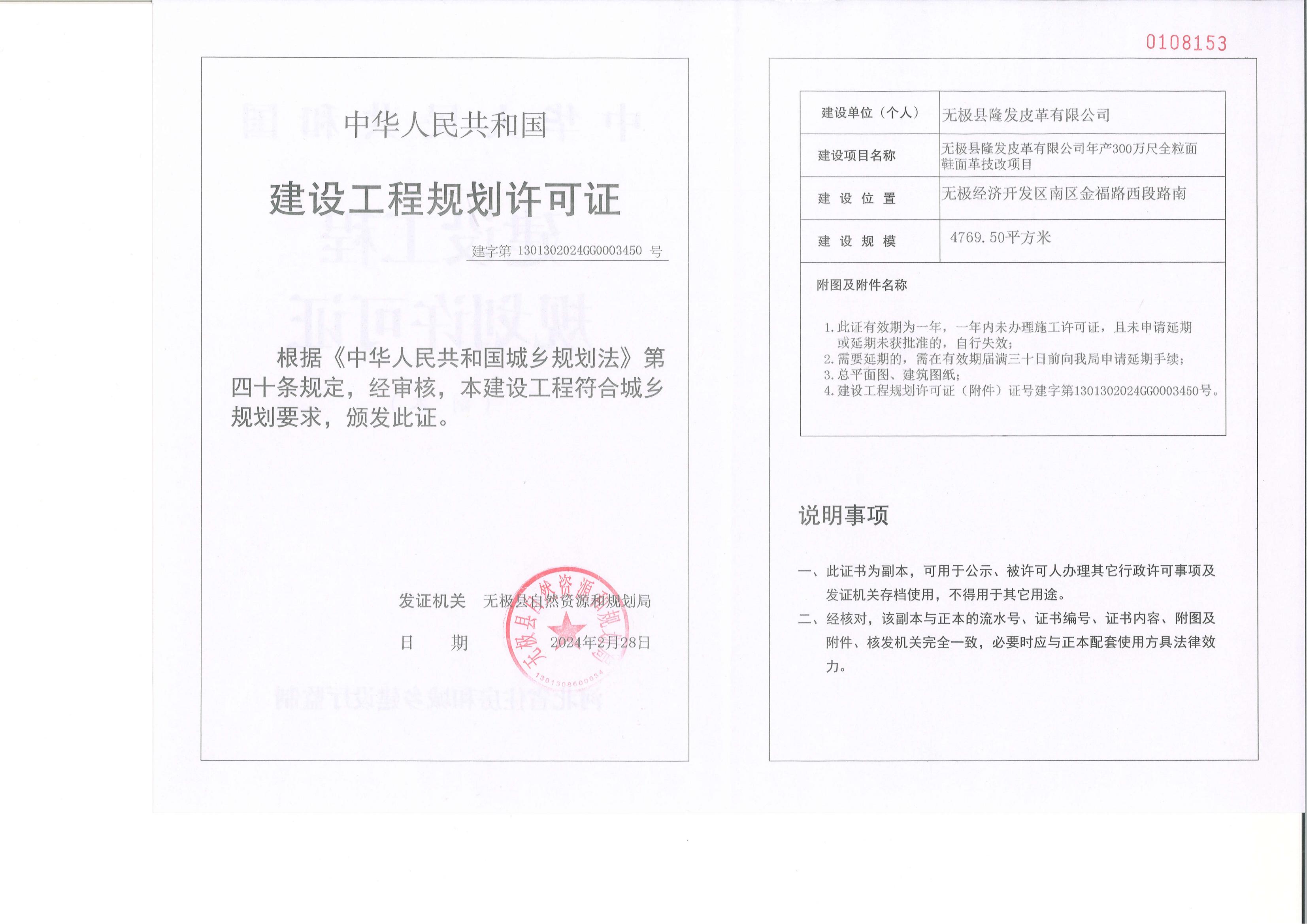 无极县隆发皮革有限公司年产300万尺全粒面鞋面革技改项目批后公示