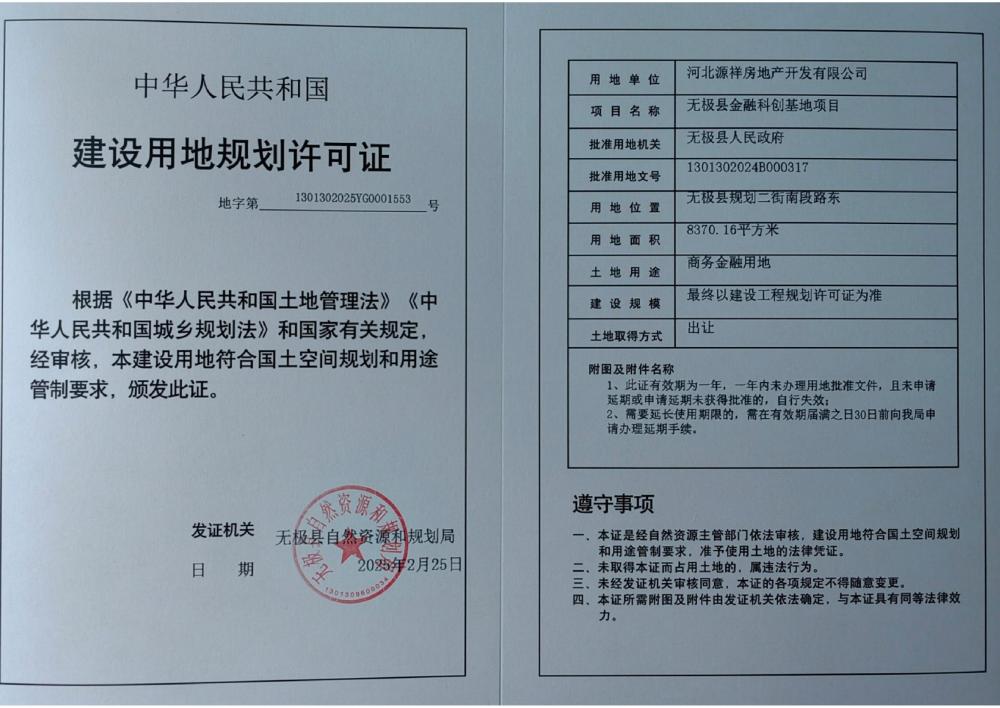 河北源祥房地产开发有限公司无极县金融科创基地项目建设用地规划许可证批后公示