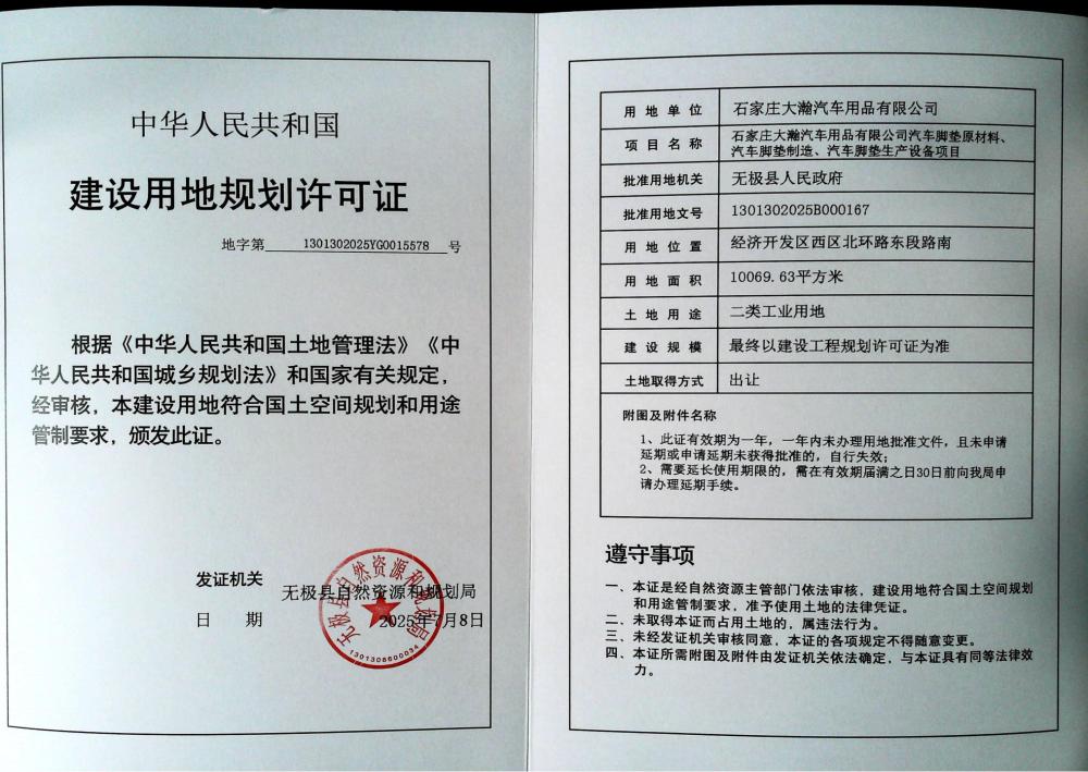 石家庄大瀚汽车用品有限公司汽车脚垫原材料、汽车脚垫制造、汽车脚垫生产设备项目建设用地规划许可证批后公示