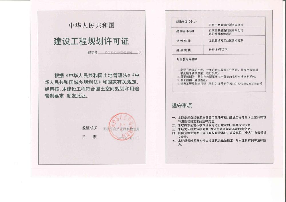 石家庄嘉盛新能源有限公司锅炉提升改造项目建设工程规划许可证批后公示