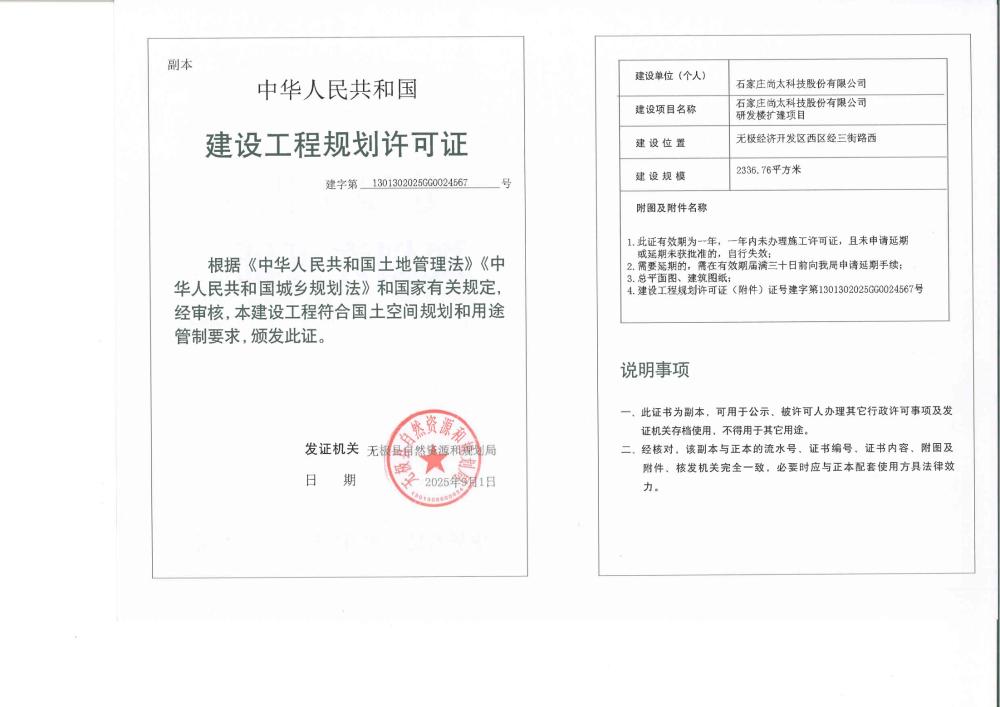 石家庄尚太科技股份有限公司研发楼扩建项目建设工程规划许可证批后公示