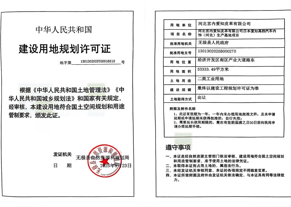 河北宫内爱知皮革有限公司日本爱知高档汽车内饰(河北)生产基地项目建设用地规划许可证批后公示