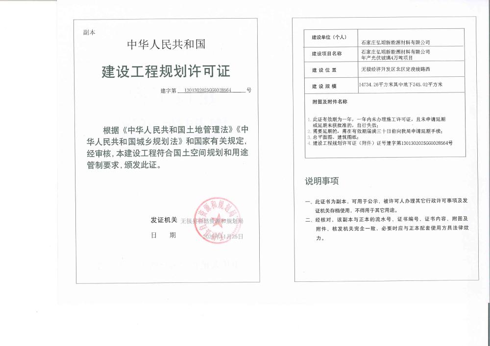 石家庄弘翊新能源材料有限公司年产光伏玻璃4万吨项目建设工程规划许可证批后公示