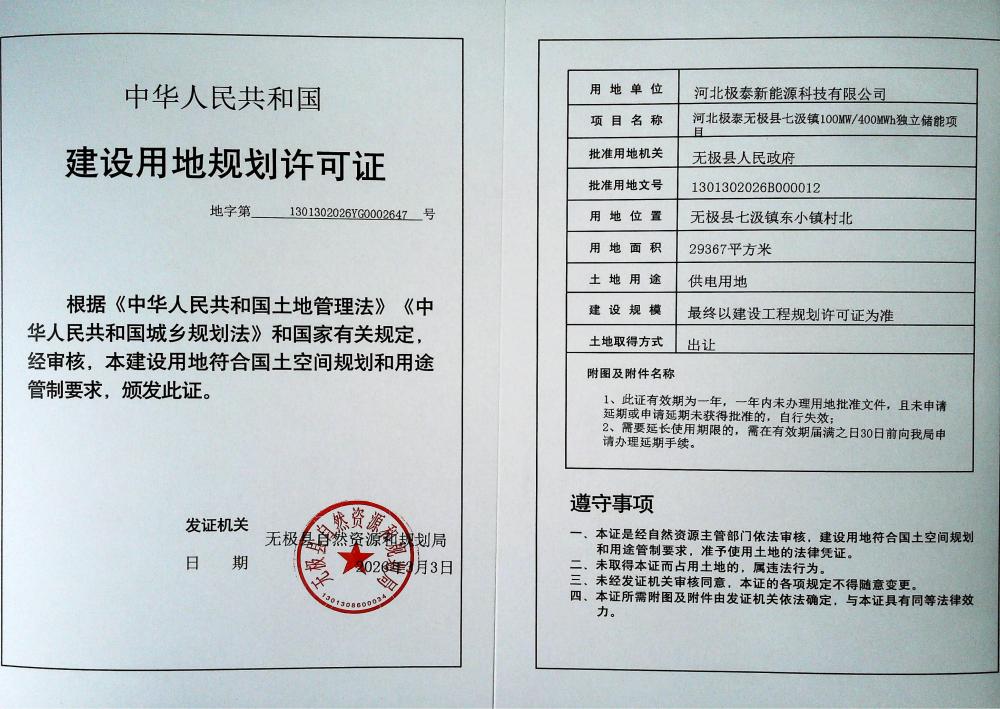 河北极泰无极县七汲镇100MW/400MWh独立储能项目建设用地规划许可证批后公示