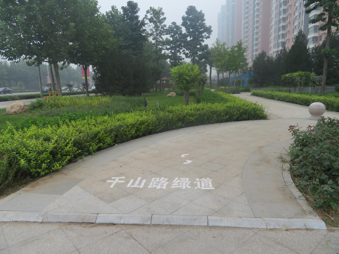 千山路大道作为我县迎宾景观大道,西起贸易街东至智慧街。千山路北邻平安公园,南邻千山路带状公园。道路总长2700米,红线宽度50米,道路断面形式一板二带式,两侧花池各4米,花池外侧4米种植行道树法桐、国槐。两侧花池面积20400平方米,行道树面积20400平方米;绿化率30.22%。苗木种植雪松、金叶榆、红叶李、月季、大叶黄杨篱等。2016年被石家庄市园林局命名为“市级园林式街道”2017年投资绿化资金600万对千山路进行了提升改造,达到省级园林式街道标准。