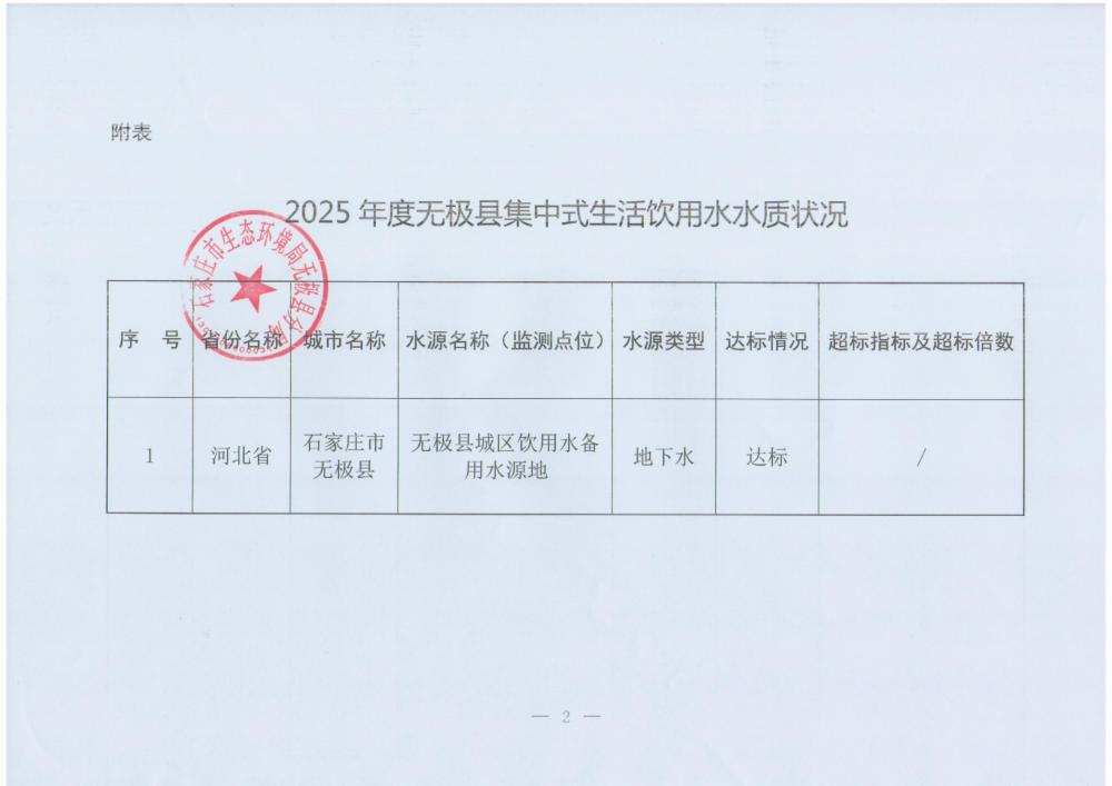 石家庄市生态环境局无极县分局 关于无极县集中式生活饮用水水质状况的公示(2025年度)